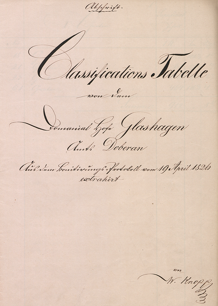 Die Tradition der Gebäude und Erbpacht-Ländereien praestitis praerstandis in Termino Johannis 1829. Dem Erbpächter werden dabei keinerlei Monituren[Beanstandungen] gestattet, vielmehr muß er die Gebäude, Ländereien, Saaten und Einfriedungen, ohne Erinnerung in dem Zustande als gut unbedingt annehmen, worin sich solches alles alsdann befinden wird. Den abziehenden Zeitpächter hat der Erbpächter wegen alles dasjenige zu entschädigen und abzufinden wofür er contractlich Vergütung verlangen kann, namentlich muß er ihm die Anbau-Saaten nach dem zu Zeit der Aussaat stattgehabten Preisen, den Pfluglohn, die Brachbestellung, die Gräben und die Dungfuhren aber nach Landüblichkeit bezahlen. Dem Erbpächter steht es frei, im Herbste dieses Jahres und im Frühjahr künftigen Jahres einen Saaten-Empfänger, auf seine Kosten nach Glashagen zu senden, dafür billige Wünsche der abziehenden Pächter möglichst berücksichtigen wird. Wegen Aufnahme und Beköstigung desselben muß sich jedoch Erbpächter mit dem Abtreter vereinbaren.