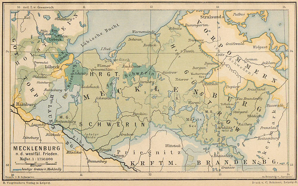 Vorheriges Bild 1648-Karte Mecklenburg repro 1892 Die politische Landschaft Mecklenburgs, nach dem Dreißigjährigen Krieg.
